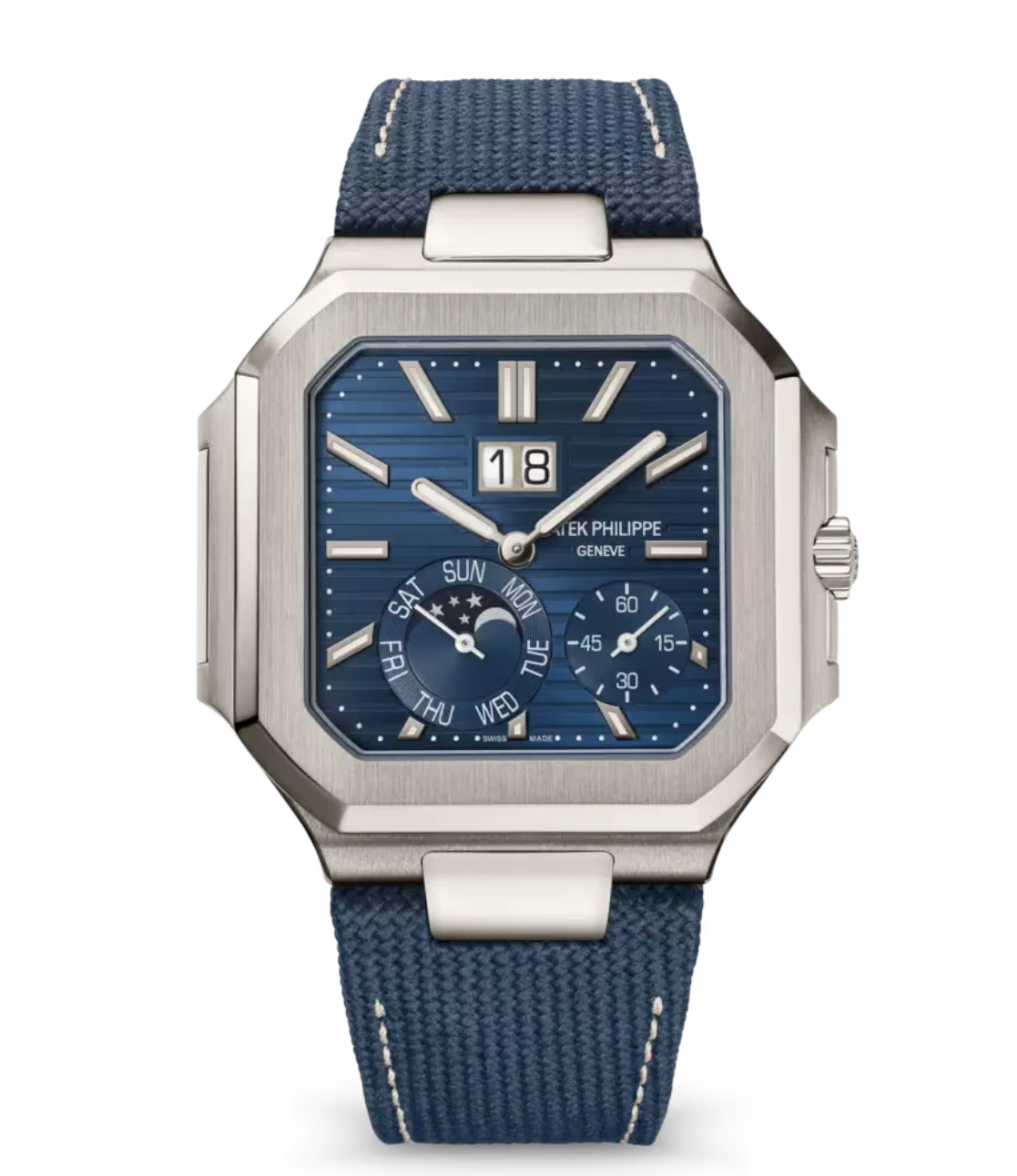Patek Philippe Cubitus Platinum, Baguette-cut diamond set at 6 o’clock and Sunburst blue dial navy blue Composite material, fabric strap Ref. 5822P-001